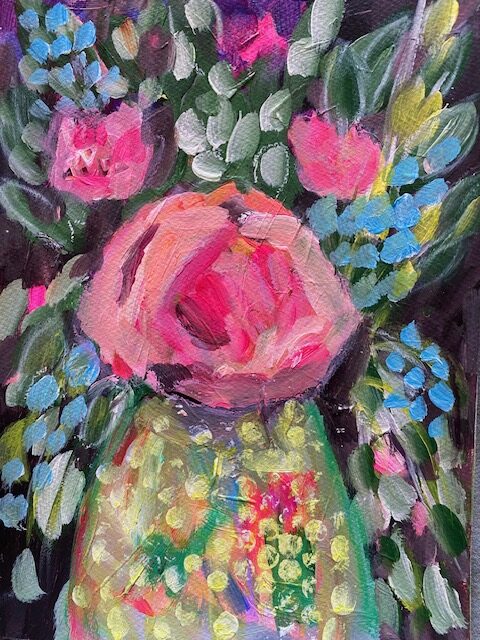 A richly textured floral painting capturing the vibrant beauty of garden roses arranged in a glass vase. Painted with expressive brushwork and layered colour the flowers emerge from deep greens and shadowed foliage creating a sense of depth and lush