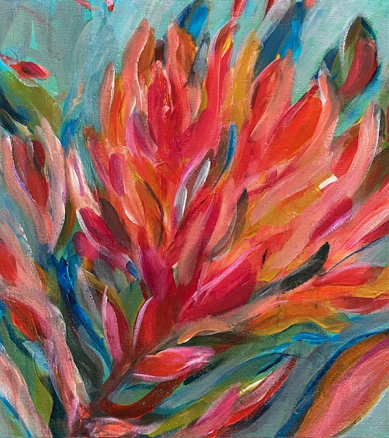 Acrylic on canvas board 40 by 40 cms unframed. This captures the vibrant energy of a tropical garden in full bloom with layers of coral, flame red, and warm peach rise from cool acqua and tourquoise foliage creating a striking contrast of heat and freshness.